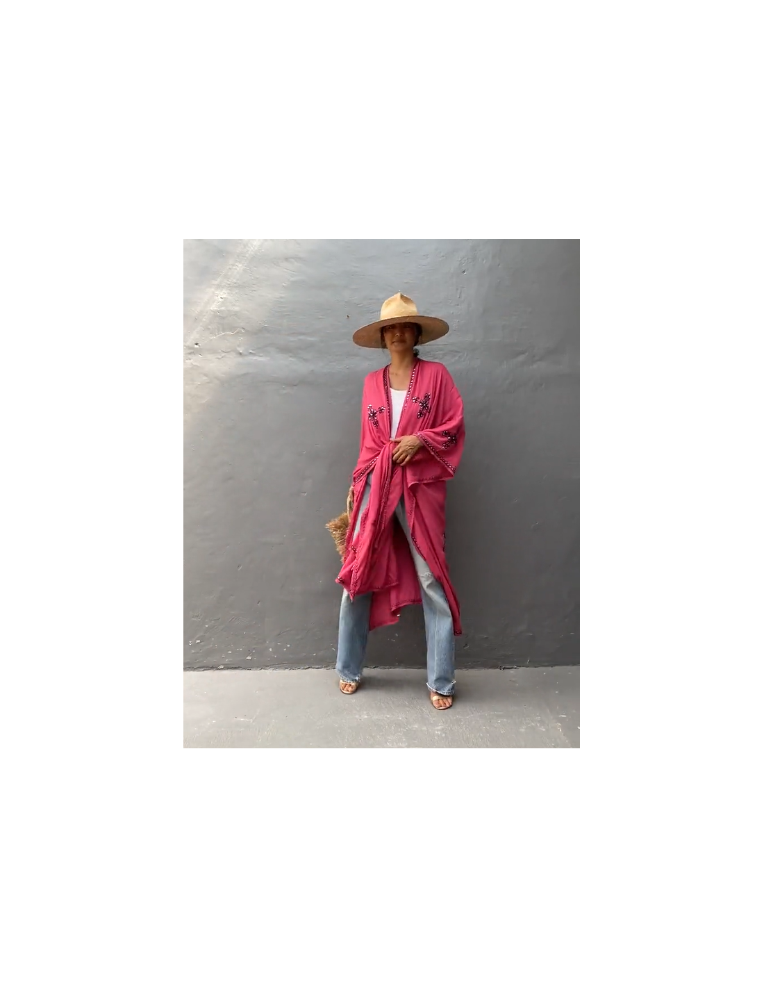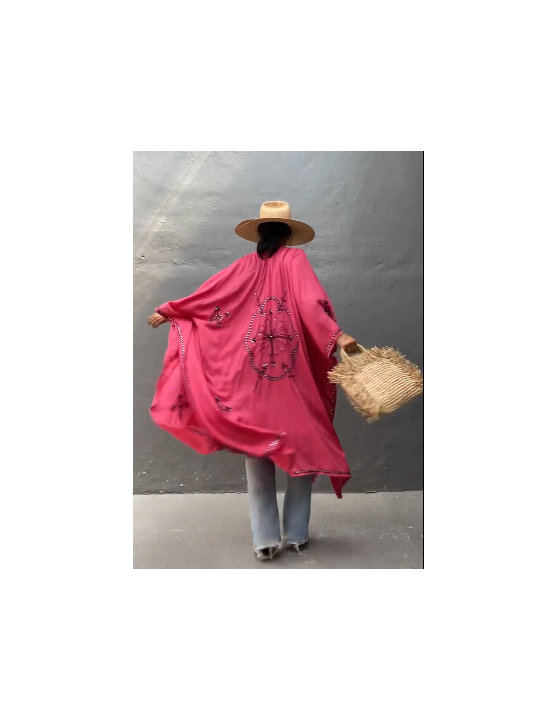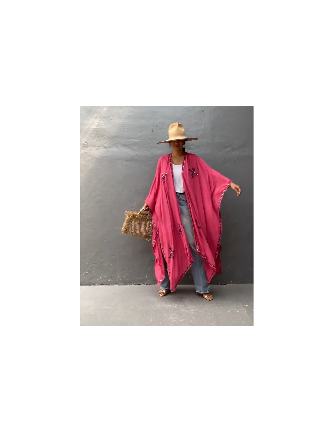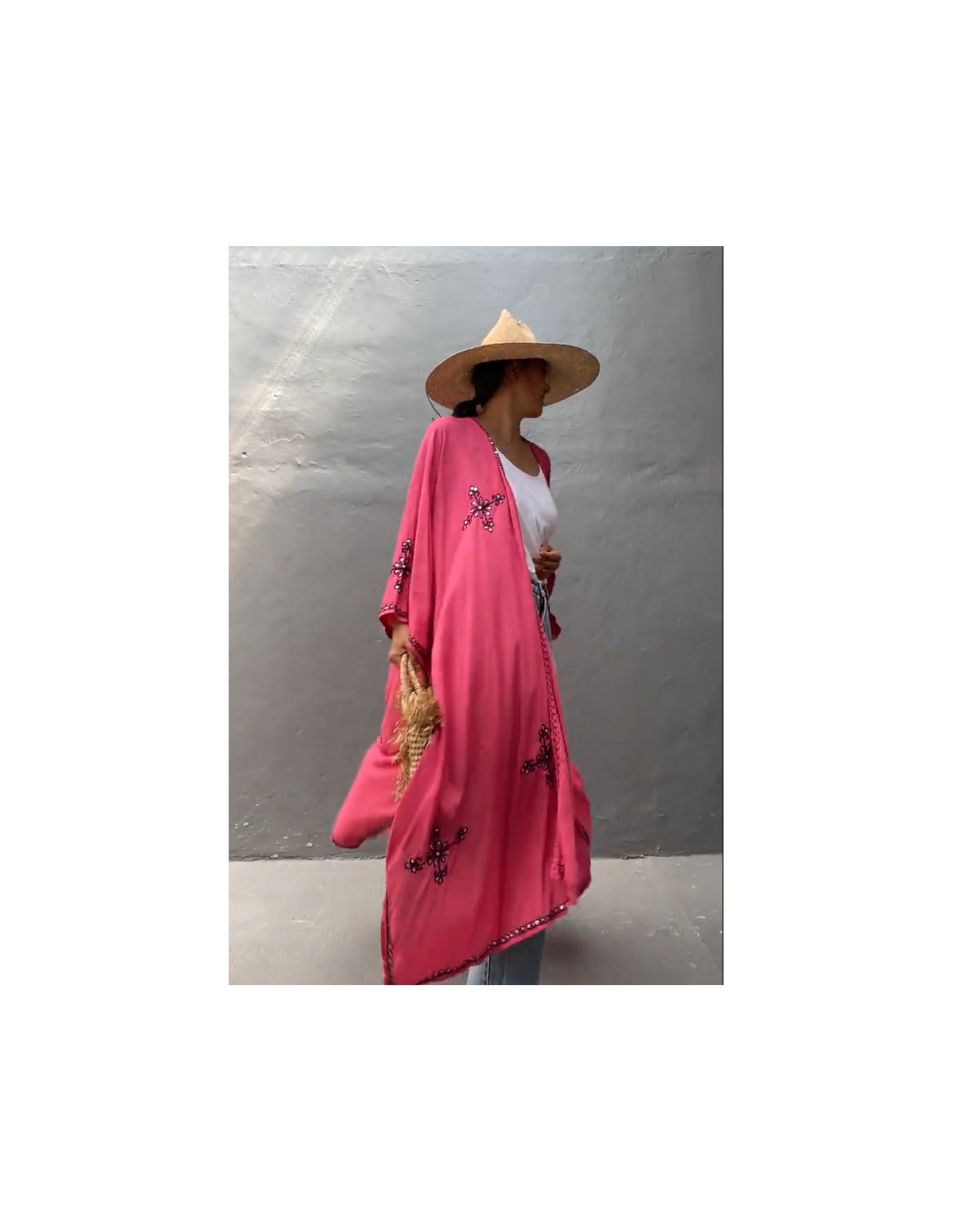 Kimono hecho a mano, bordado color fresa perfecto para el verano. Para la playa, piscina o para las largas tardes de verano. El gran protagonista de esta verano en las terrazas mas cool.