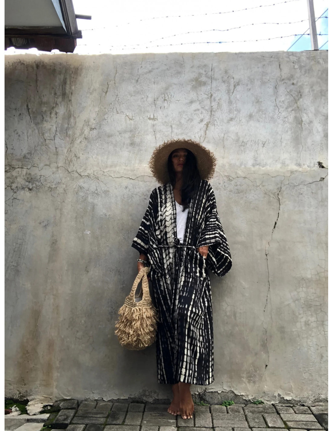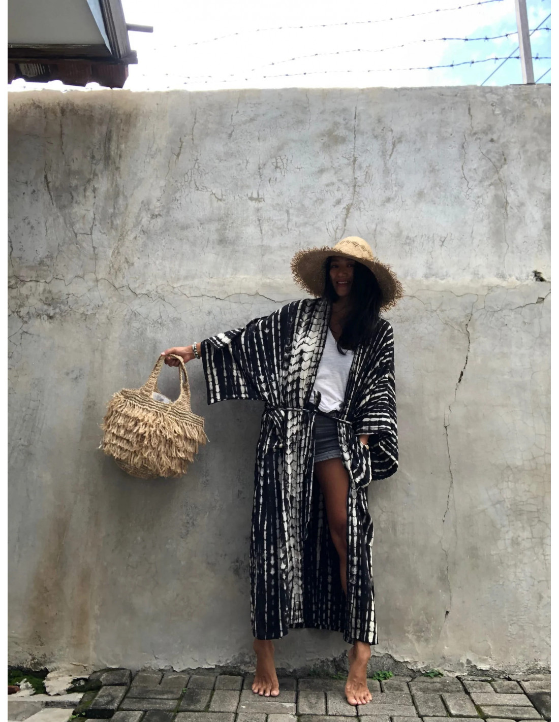 Kimono Tie-Dye negro de rayón super fresquito para que puedas lucirlo aun cuando más apriete el sol. Lleva cinturón.