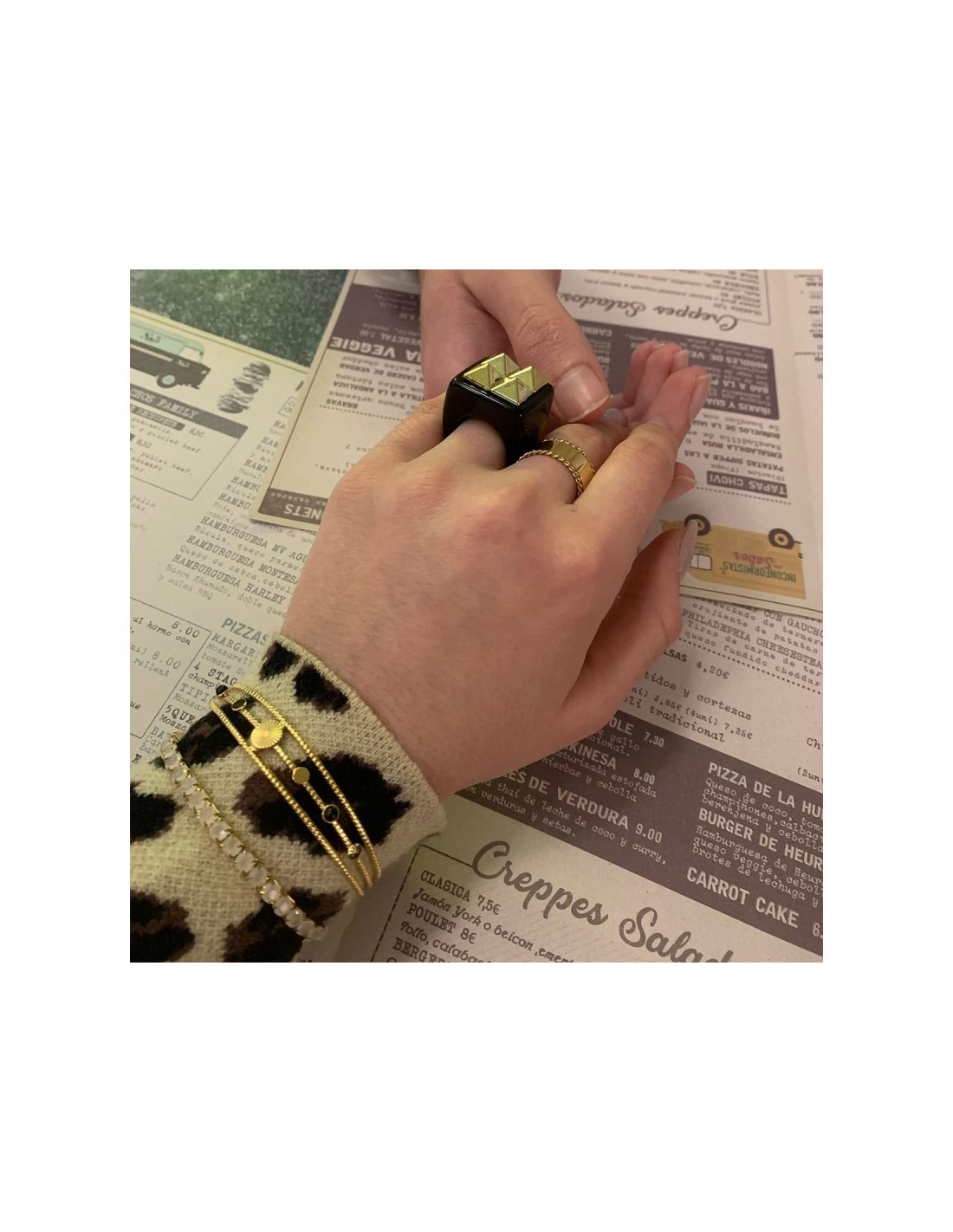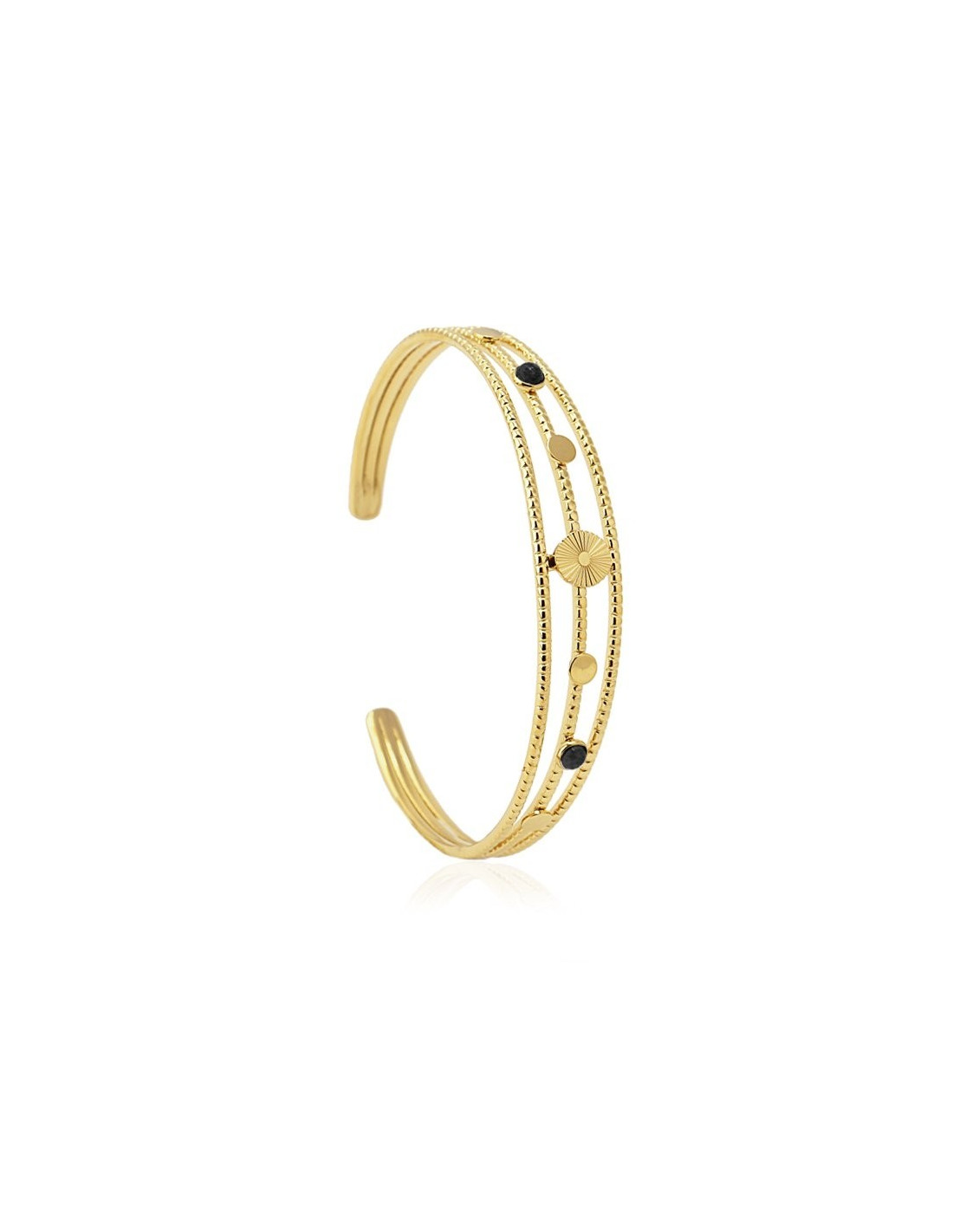 Brazalete abierto y ajustable con detalles de diseños variados con piedras de cristal en color negro. Es una pieza perfecta para llevar con looks de estilo bohemio o romántico.