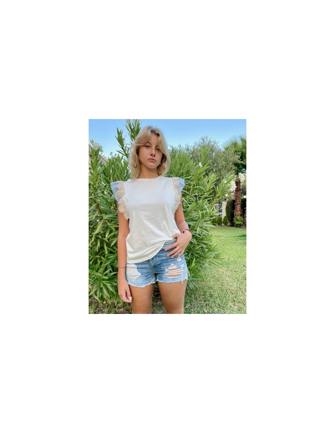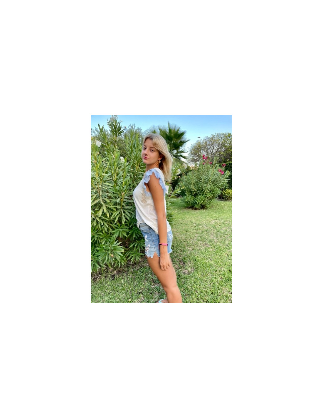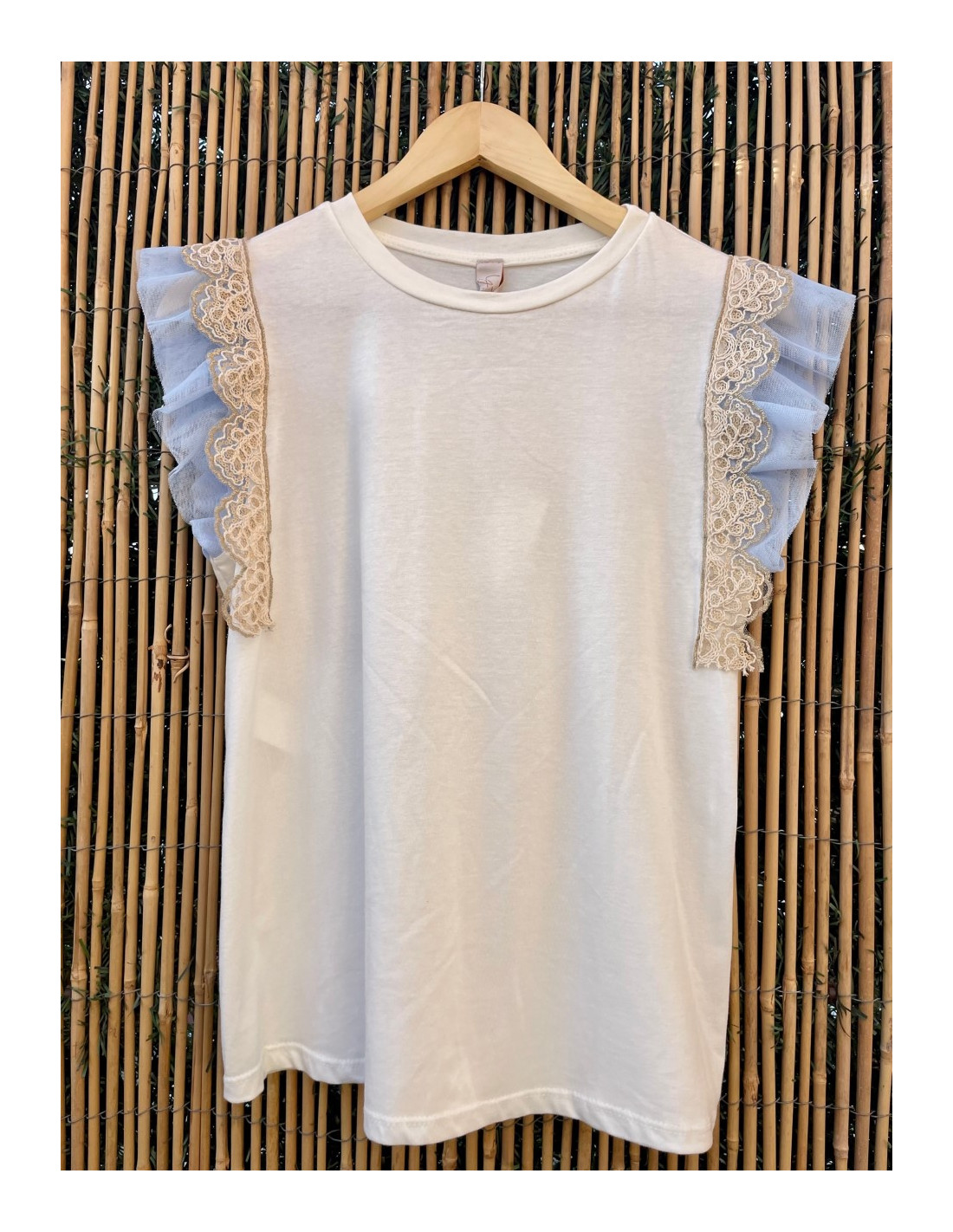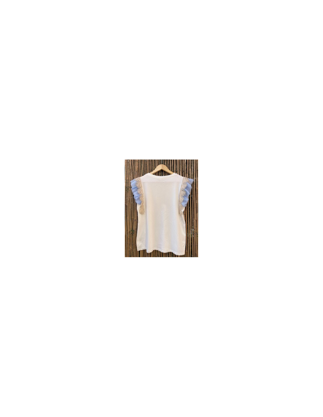 Camiseta sin mangas con detalle de cenefa en beig y tul azul de tacto muy suave.