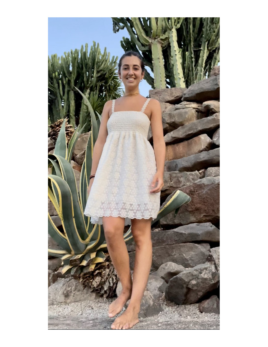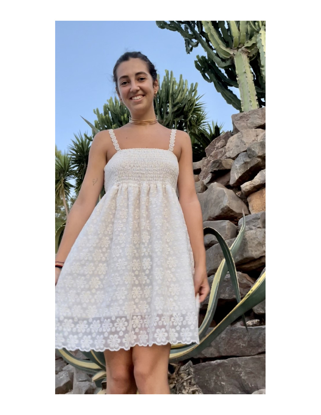 Vestido corto bordado con nido de abeja ajustable en la parte alta con forro interior.  Lleva tirantes de pasamanería.