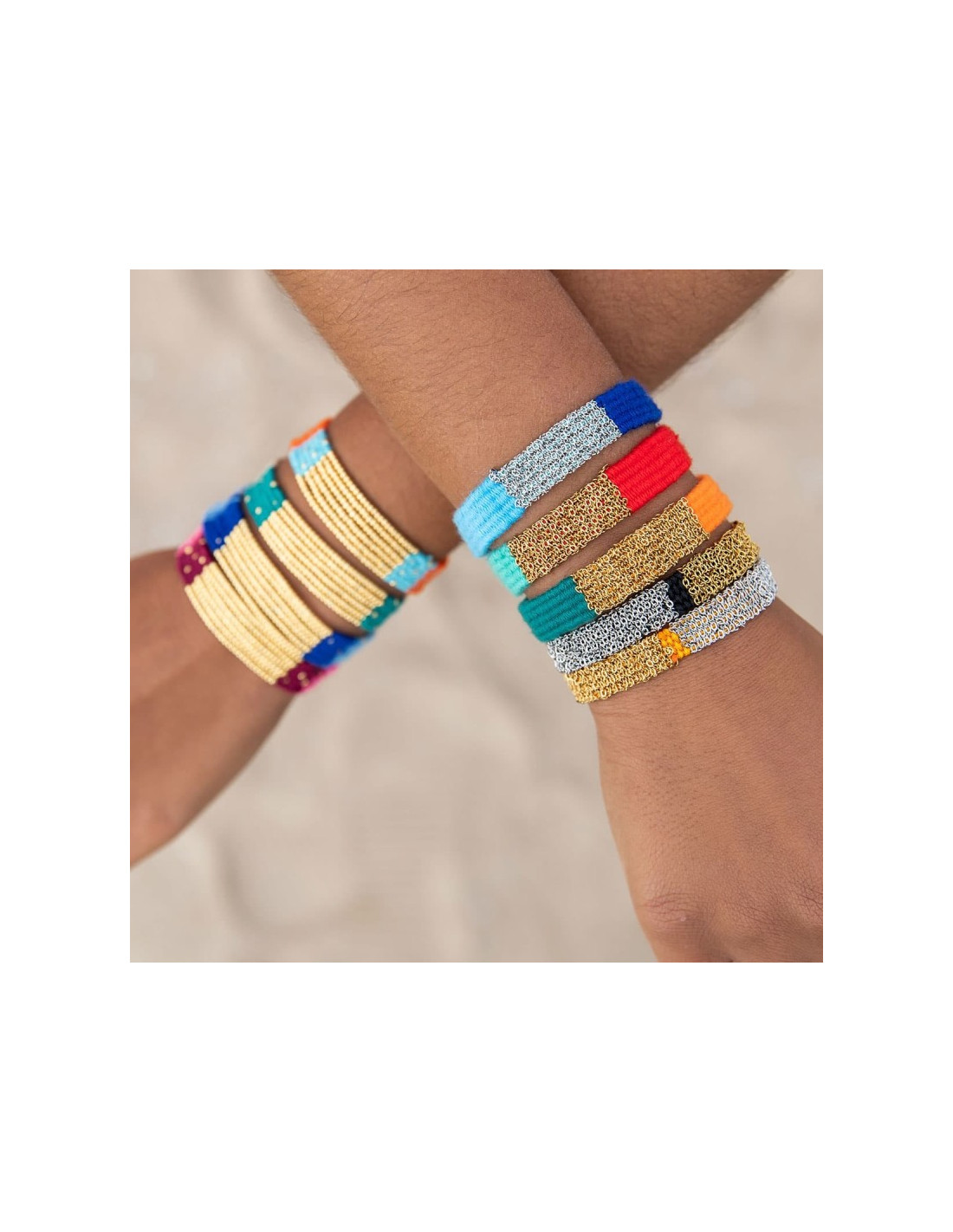 Pulsera lana rojo y turquesa con malla de acero dorada