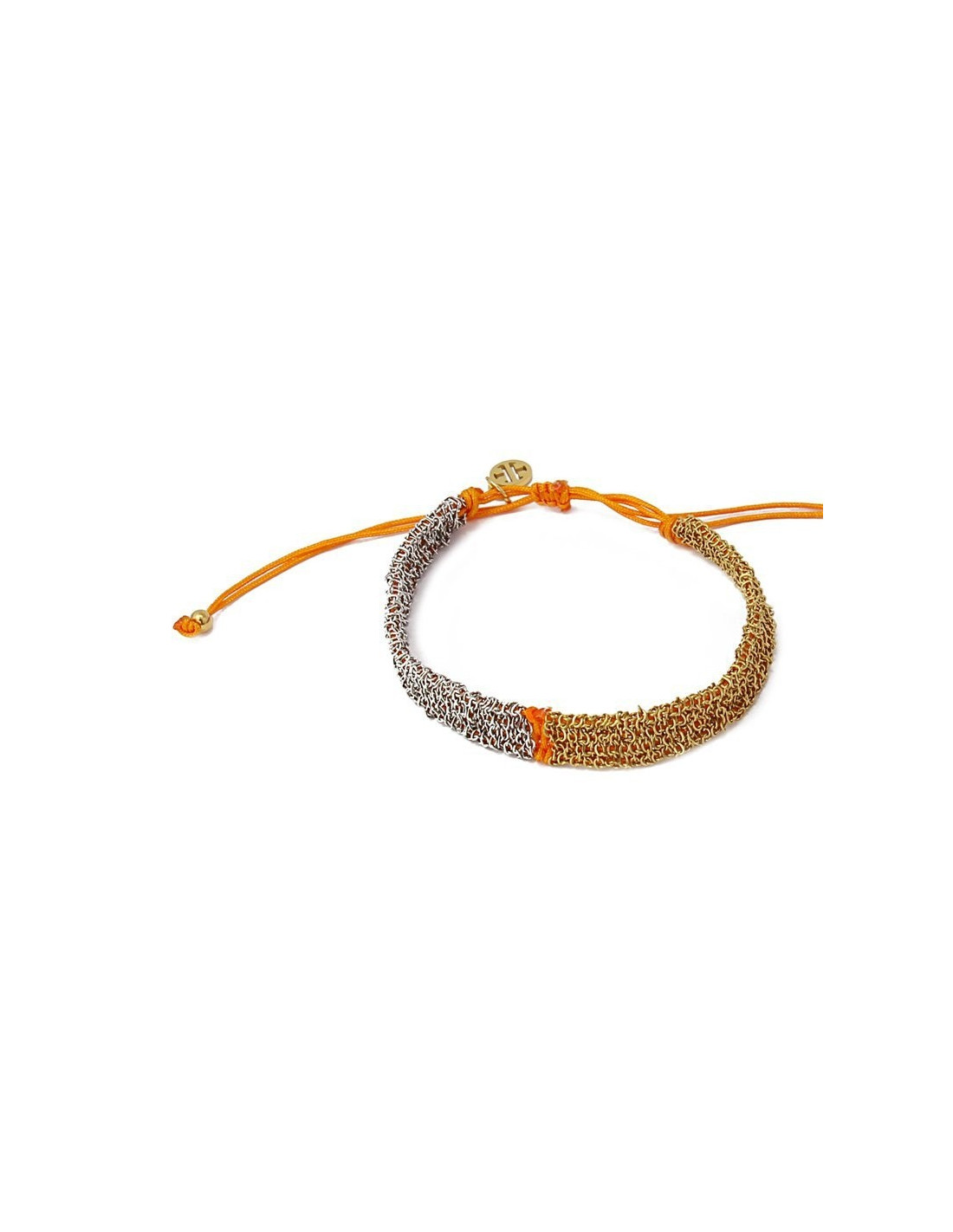 Pulsera lana naranja  con malla de acero dorada y plateada